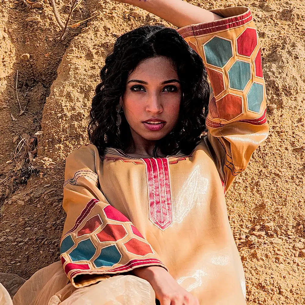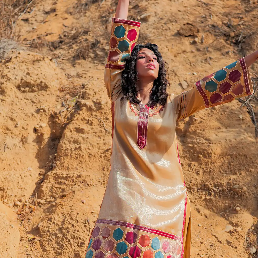 AYZEL COPPER KURTA WITH APPLIQUE ON THE BORDER AND SLEEVES WITH HEAVY NECK EMBRIODERY ALONG WITH DUPPATTA WITH APLIQUE EMBRIODERED BORDERS.