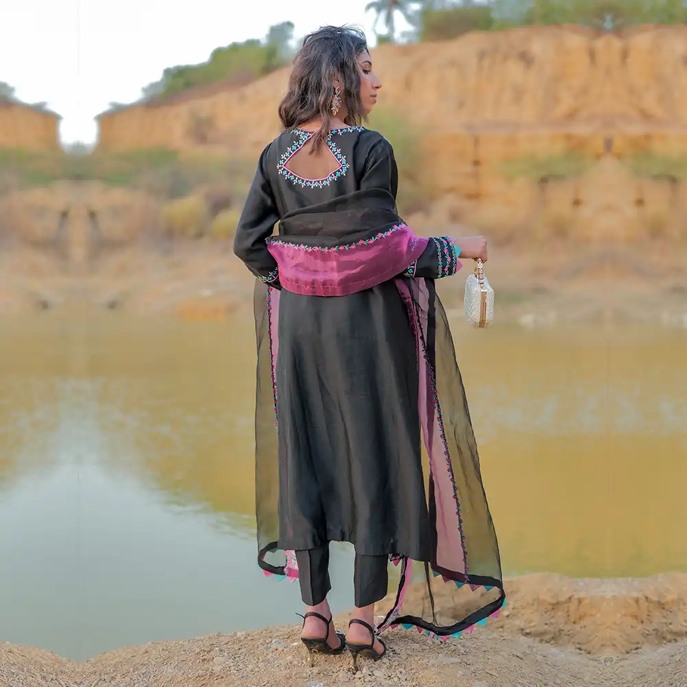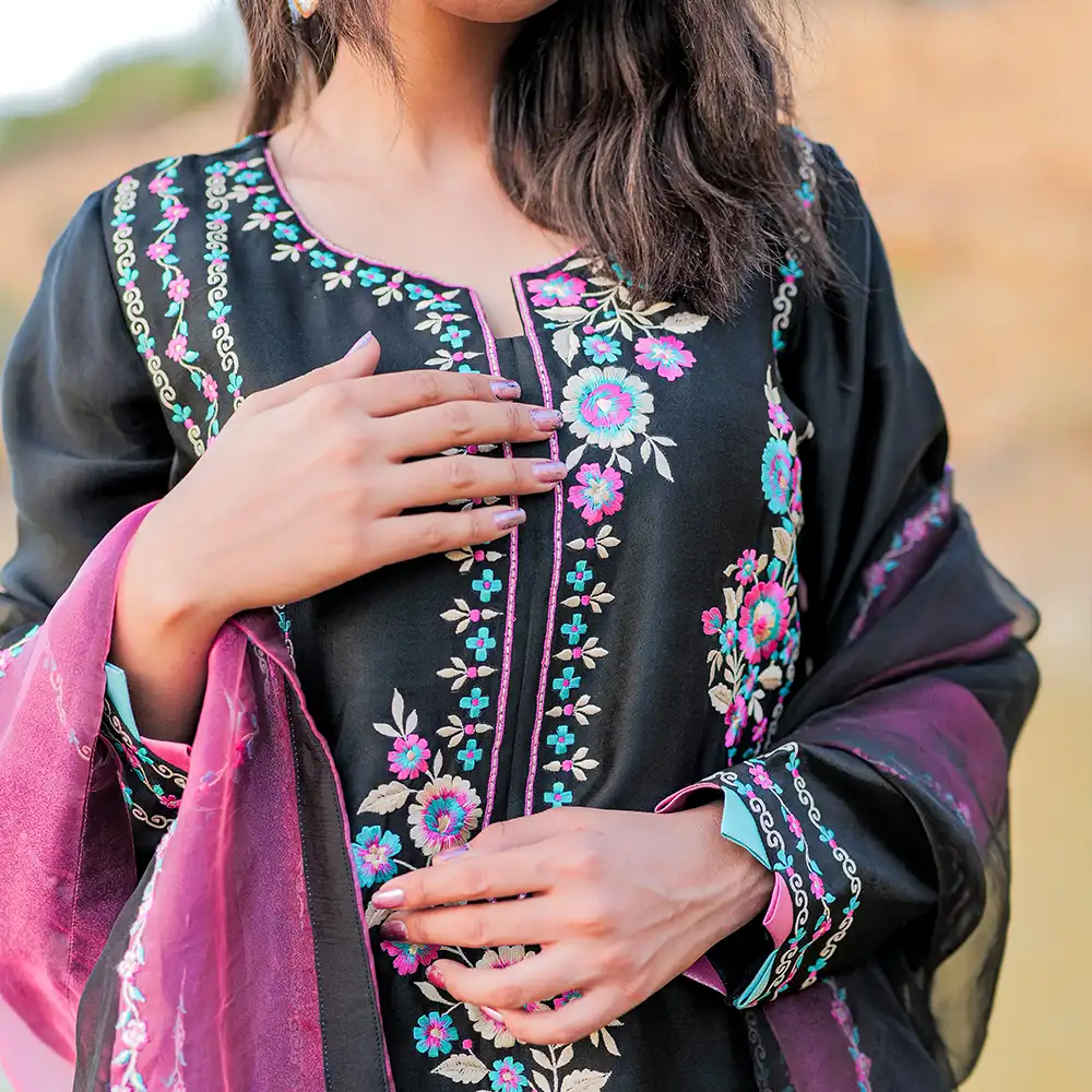 EMEL : EMBRIODERED KAMEEZ WITH TWO TONE APPLIQUE DUPATTA PAIRED WITHSTRAIGHT PANTS.