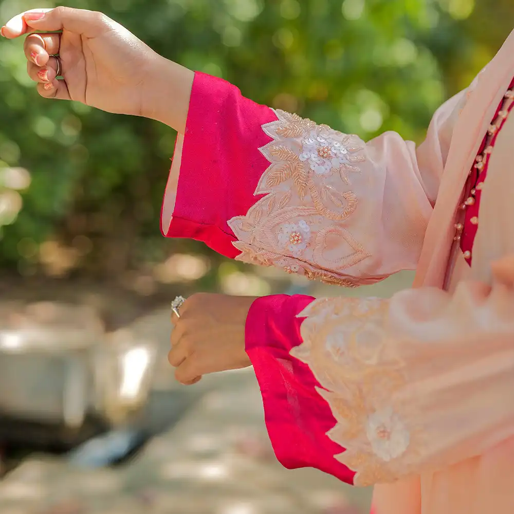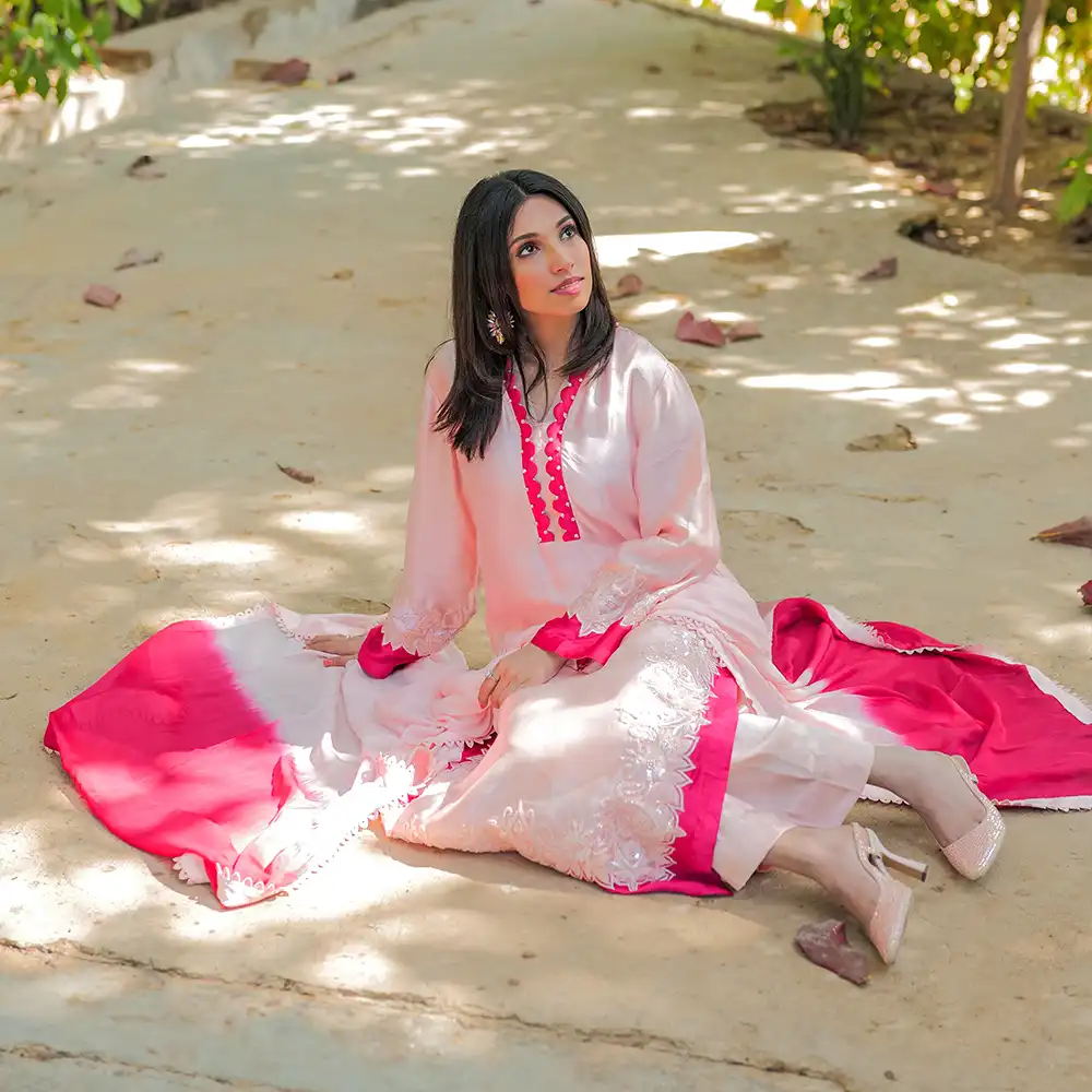 GUL : SLIT CUTWORK KAMEEZ & CULOTTES PAIRED WITH TWO-TONE DUPATTA WITH LACE EDGING.