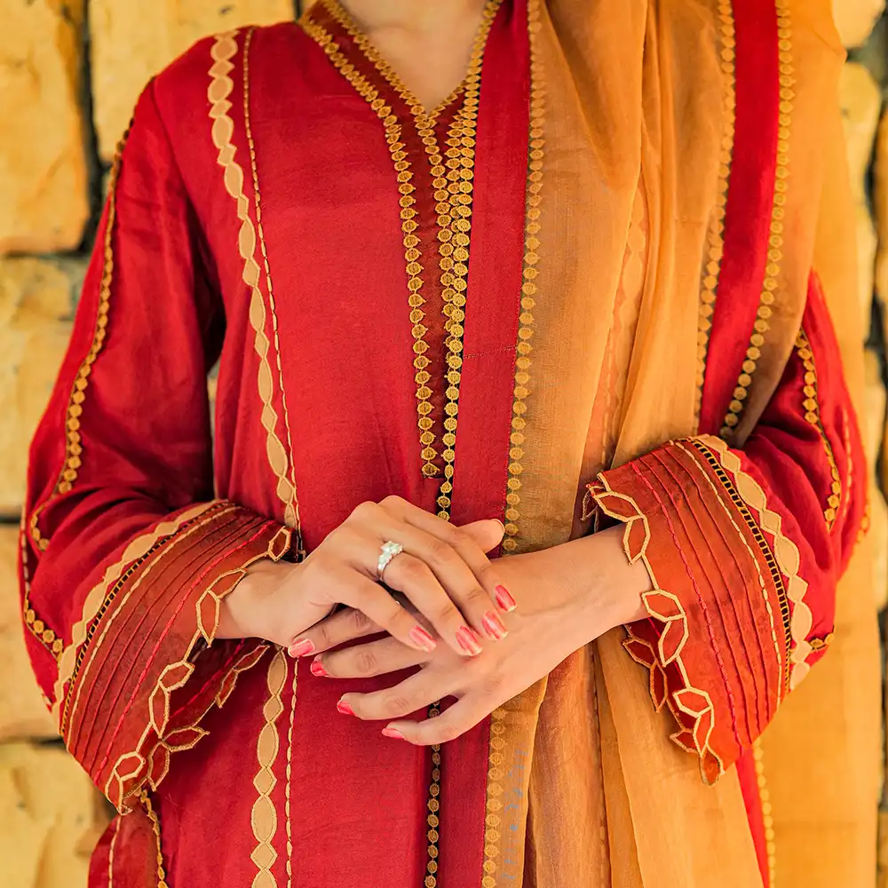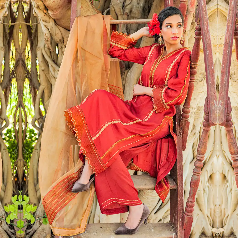 NUREH : LONG SHIRT WITH APPLIQUE AND EMBRIODERY ALONG WITH RUNNING STITCH EMBRIODERED DUPPATA PAIRED WITH EMBRIODERED CULOTTES.
