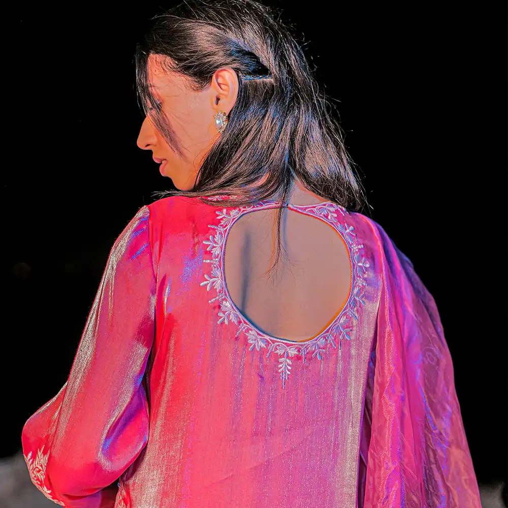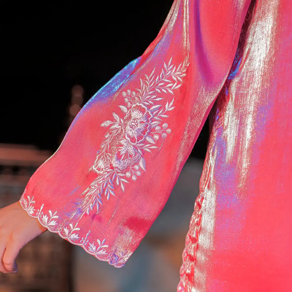 ROZEL : LONG SHIRTWITH EMBRIODERY ALONG WITH EMBRIODERED DUPATTA PAIRED WITH EMBRIODERED CULOTTES.