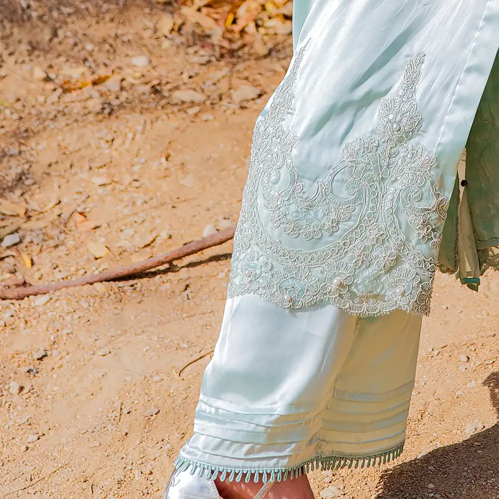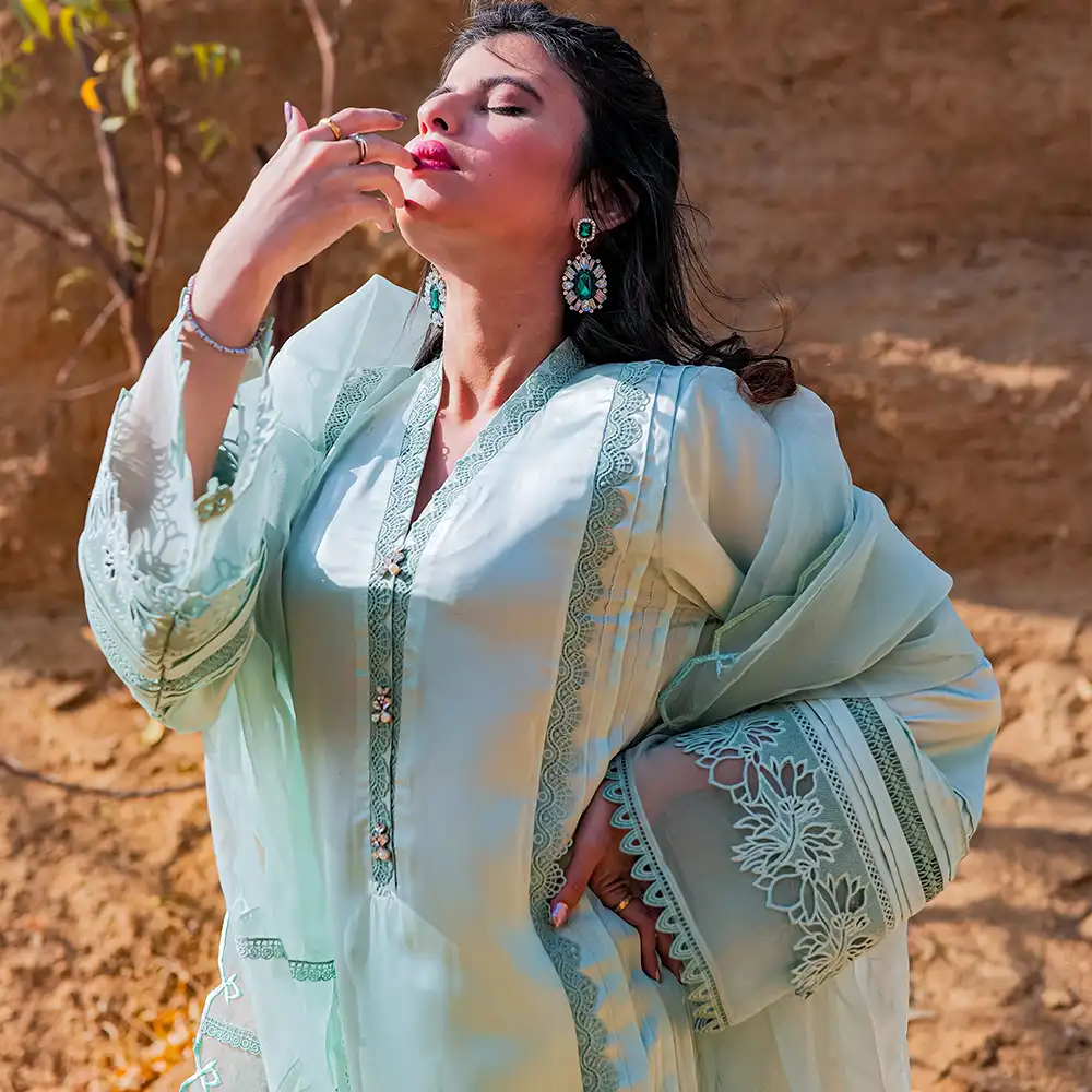 SERA : PLEATED LACED SHIRT AND ORGANZA DETAILED SLEEVES WITH EMBRIODERED DUPPATA PAIR WITH CULOTTES.