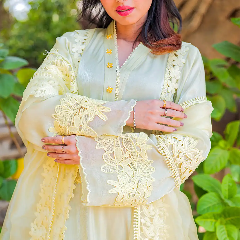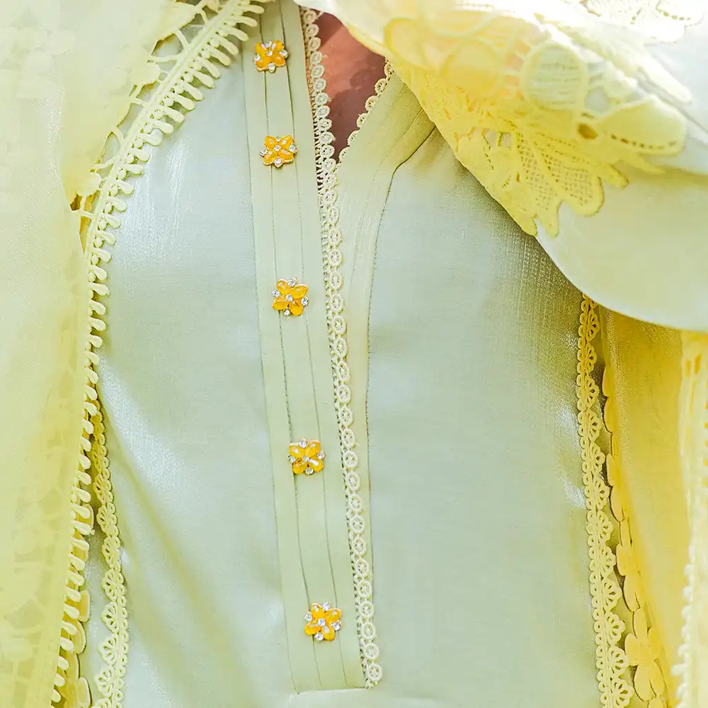 ZOE : LONG SHIRT WITH LACE DETAILING AND EMBELLISHED BUTTONS ON NECK WITH EMBRIODERED LACE DUPATTAPAIRED WITH STRAIGHT PANTS.